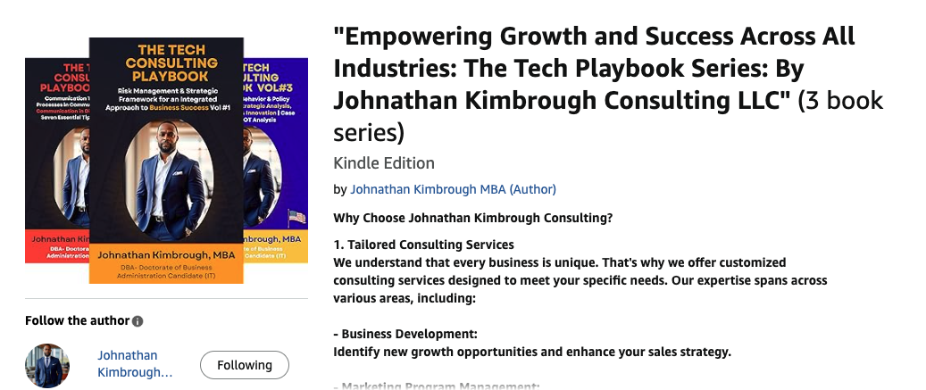 Johnathan Kimbrough is a seasoned author, combat veteran, and consultant with over 20 years of experience in executive consulting. He holds an MBA in Global Business Management and is a Doctoral Candidate in Business Administration. His expertise spans global business development, local engagement, operations, process improvement, quality management, and supply chain management.